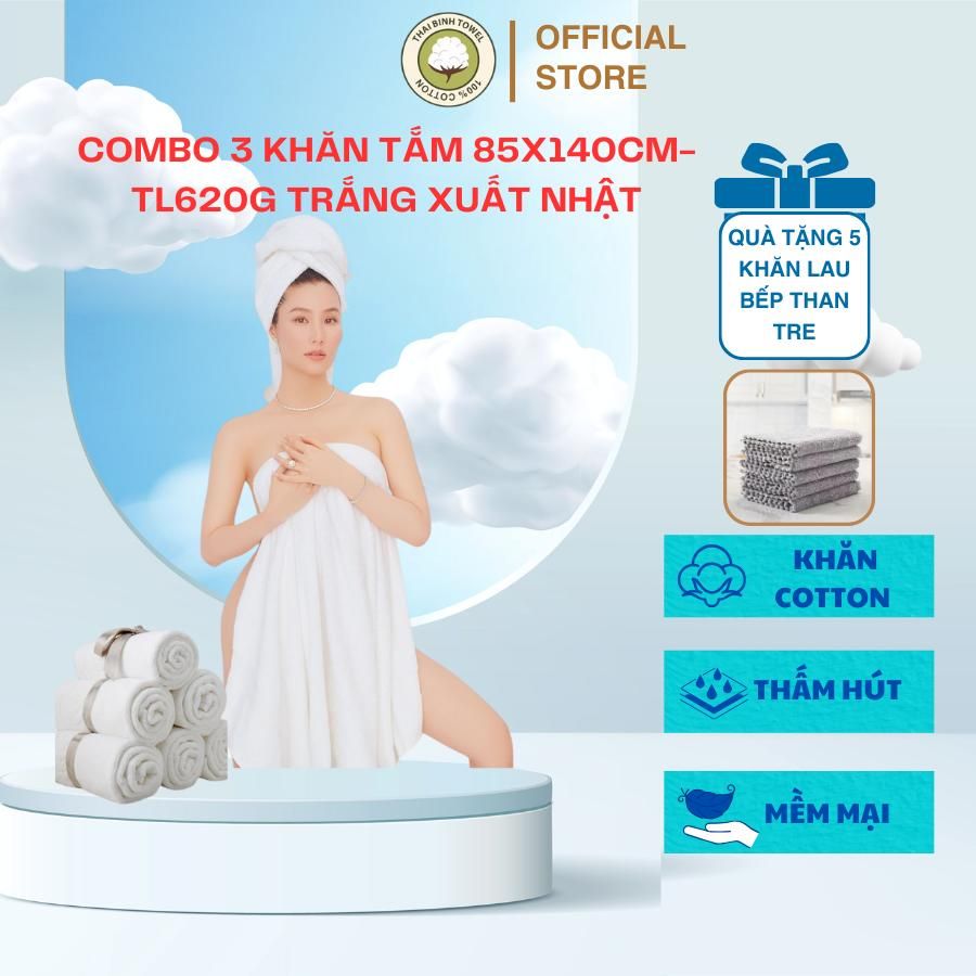 Combo 3 Khăn Tắm Khách Sạn Cỡ Đại Xuất Nhật 85x140cm -620g - Thai Binh Towel 100% Cotton Siêu Thấm Hút Không Xù Bông khăn tang trắng khăn khach san