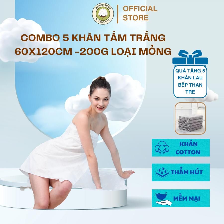 Combo 5 Khăn tắm nhà nghỉ 60x120cm loại mỏng 200g (Tặng 5 khăn lau bếp than tre) THAI BINH TOWEL làm từ sợi Cotton mềm thấm hút nước Nhà Tắm khantamtrang khăn tang trắng khăn tắm